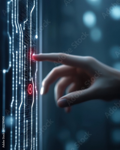 A close-up of a hand interacting with a digital interface, showcasing modern technology and user engagement with circuits.