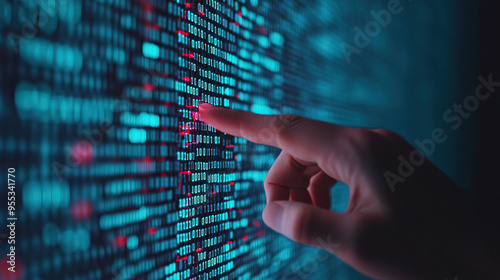 A close-up of a hand interacting with digital data on a screen, showcasing technology and innovation in a modern environment.