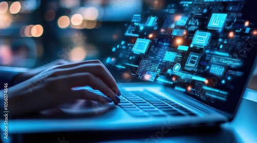 A close-up of a hand typing on a laptop displaying data and technology graphics.