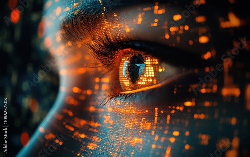 A Close-Up of a Human Eye, Digitally Enhanced with Glowing Orange and Blue Circuitry, Representing the Fusion of Technology and Humanity in the Digital Age