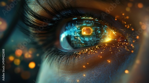 A close-up of a human eye with glowing blue digital circuitry and a holographic interface reflected in the iris, surrounded by soft futuristic lighting.