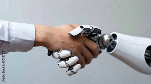 A close-up of a human hand shaking a robot hand, representing future collaboration, technology integration, and AI partnerships.