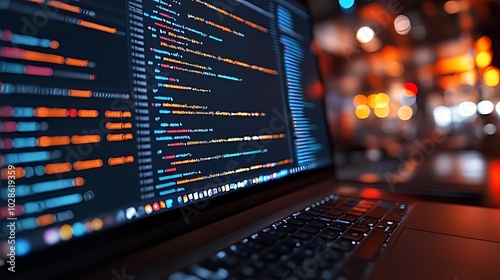 A close-up of a laptop displaying code on its screen, with blurred city lights in the background.