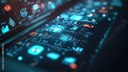 A close-up of a laptop screen filled with futuristic digital icons, representing smart technology and innovation.