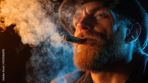 A close-up of a man enjoying a cigar, enveloped in a dreamy cloud of smoke, highlighting contrasts of light and his rugged facial features, creating an intriguing visual narrative.