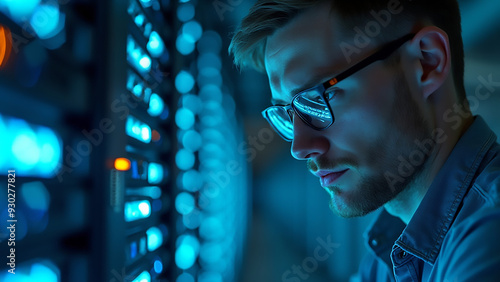 A close-up of a man intensely working in a futuristic server room, with soft blue lights reflecting off her face and glasses, emphasizing the high-tech environment.