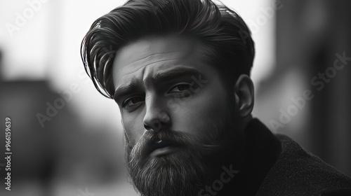 A close-up of a man with a full beard and a stylish quiff hairstyle, combining facial hair with a modern hairdo to create a bold, distinctive look.