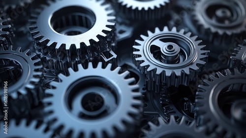 A close-up of a mechanical gear system with a metallic sheen, featuring a variety of gears in different sizes and orientations, set against a dark, industrial background.