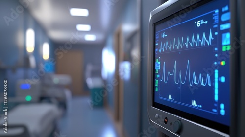 A close-up of a medical ventilator screen displaying real-time respiratory data, illuminated in a dimly lit hospital room.