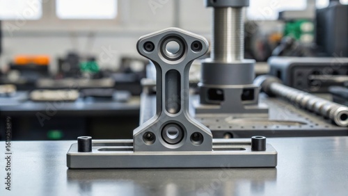 A close-up of a metallic machine part on a workshop table, showcasing precision engineering and craftsmanship in a manufacturing environment.