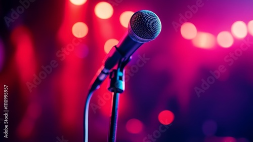 A close-up of a microphone against a colorful, blurred background, suggesting a performance or event.