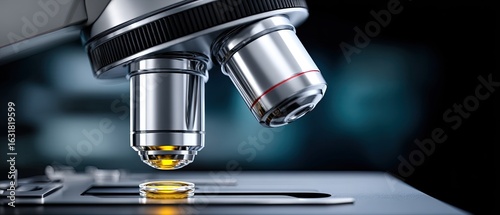 A close-up of a microscope's objective lenses focusing on a glass slide, showcasing scientific equipment and precision in research.