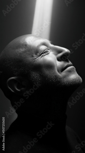 A close-up of a middle-aged Caucasian man with a peaceful expression, smiling gently while illuminated by soft light from above