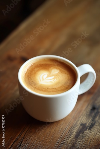 A close-up of a mug of coffee with beautiful latte art sitting on a wooden table, ready to be enjoyed.