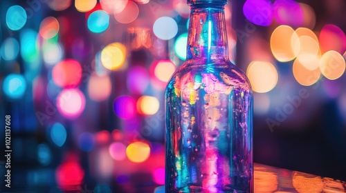 A close-up of a neon-lit glass bottle with colorful light refractions, creating a dreamy, otherworldly atmosphere
