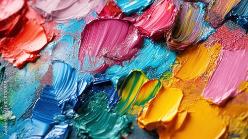 A close-up of a palette with colorful oil paints, showing different strokes and textures.