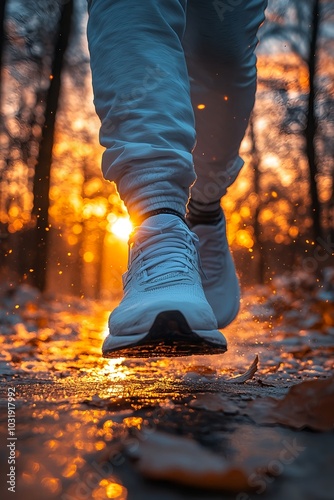 A close-up of a person walking on a wet path, illuminated by the warm glow of the sunset in an autumn forest, with golden leaves scattered across the ground