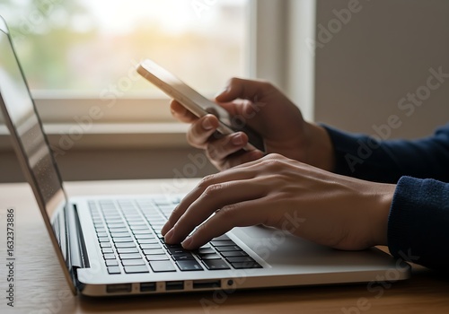 A close-up of a person's hands and a smartphone, demonstrating modern, connected productivity on a laptop.
