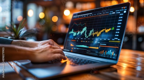 A close-up of a persons hands typing on a laptop with a financial data chart on the screen