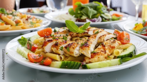 A close-up of a plate of grilled chicken pasta salad with cucumber and tomatoes