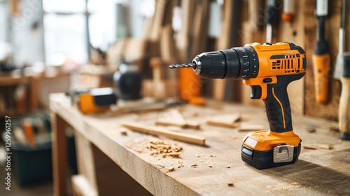 A close-up of a power drill with a wood bit installed, resting on a workbench.