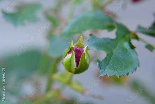 A closeup of a red rose bud as begins to open and reveal its petals.