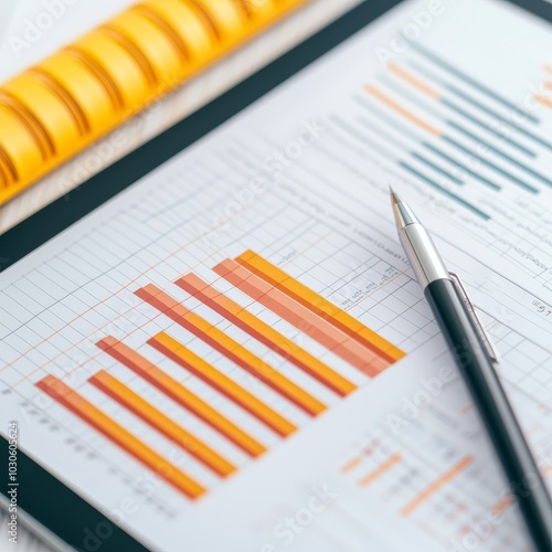 A close-up of a report featuring colorful bar graphs and charts, accompanied by a pen and a spiral notebook, emphasizing data analysis and business insights.