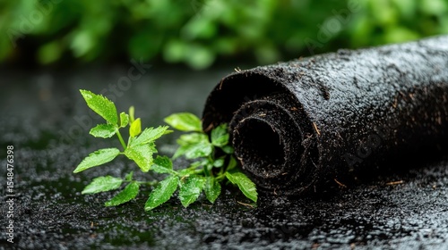 A close-up of a rolled black fabric with a tiny green leaf emerging, symbolizing resilience and the beauty of nature amidst human-made materials and elements.