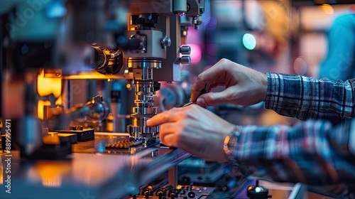 A close-up of a scientist's hands working with a mass spectrometer, showing the intricate details of the setup.