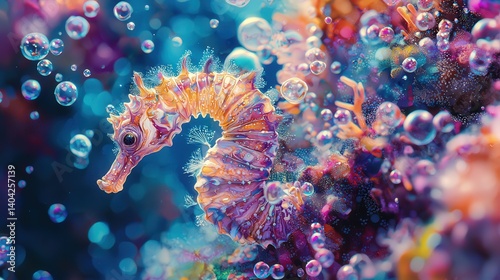 A close-up of a seahorse in a vibrant coral reef, surrounded by tiny bubbles