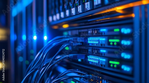 A close-up of a servers fiber optic connection, the cables glowing with light as data flows through, the server’s LED indicators flickering in the background, without brand logo, without text