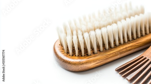 A close-up of a set of hair brushes and a comb on a white isolated background