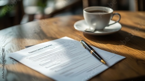A close-up of a signed insurance contract on a wooden table, with a pen and coffee cup.