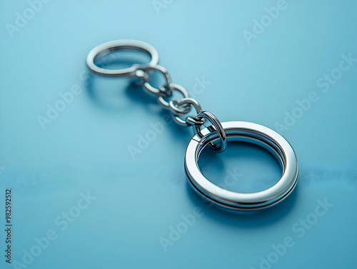 A close-up of a silver keychain ring on a blue background, showcasing its shiny surface and intricate design.