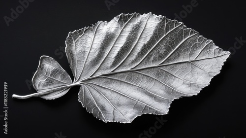 A close-up of a silver leaf in monochrome, highlighting its natural patterns and elegant symmetry