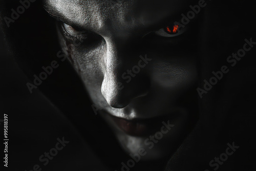 A close-up of a sinister figure shrouded in darkness, with a menacing expression and glowing red eye, evoking an eerie and ominous atmosphere.