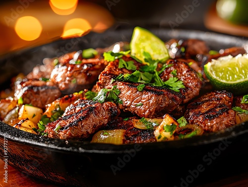 A closeup of a sizzling molcajete bowl filled with tender arrachera, grilled onions, and nopales, garnished with fresh cilantro and a wedge of lime, against a rustic wooden table