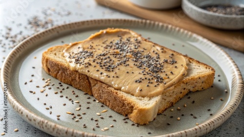 A closeup of a slice of toast lying on a textured ceramic plate with creamy nut butter being spread smoothly from edge to edge. Tiny chia seeds have been generously sprinkled