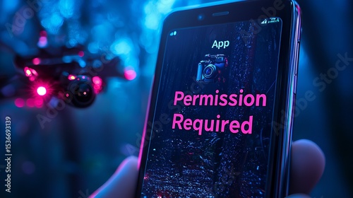 A close-up of a smartphone screen displaying 'Permission Required' app message, with a drone in the background.