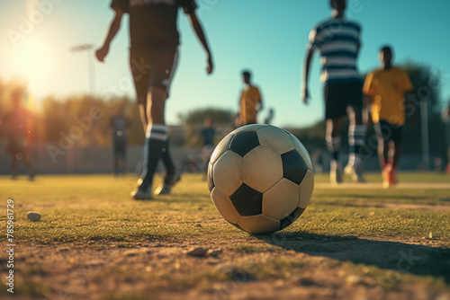 A close-up of a soccer ball on a dusty field with players in action during a sunset match, capturing the spirit of the game and community sport.