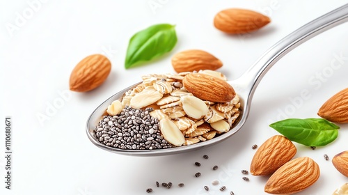A close-up of a spoon filled with chia seeds, oats, almonds, and fresh basil leaves on a white background.