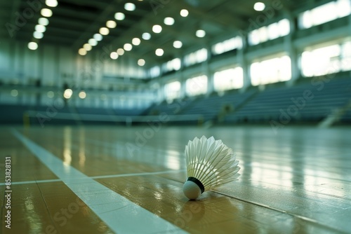 A close-up of a stationary shuttlecock resting on a polished badminton court in a large, empty stadium