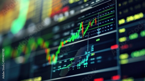 A close-up of a stock trading screen, showing various stock symbols, prices, and performance graphs, with a focus on a green upward trend line.