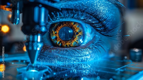 A close-up of a striking, futuristic eye showcasing intricate textures, vibrant colors, and a unique technological element emanating a glowing quality in blue tones.