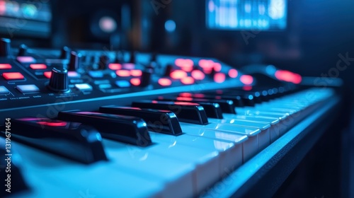 A close-up of a synthesizer keyboard highlights the electronic music elements with glowing keys and rich textures, creating a captivating atmosphere for musicians.