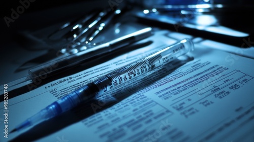 A close-up of a syringe on paperwork, surrounded by medical instruments in low light.