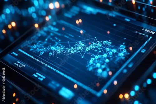 A close-up of a tablet screen displaying a data visualization with lines, dots and graphs.