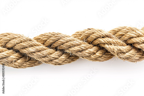 A close-up of a thick, twisted rope against a white background highlighting the texture and strength of the material