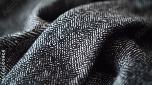A close-up of a tie with a herringbone pattern in a deep charcoal color, showcasing its intricate weave and luxurious appeal.