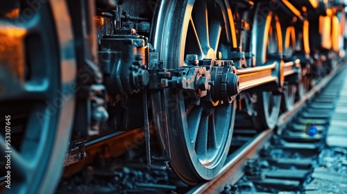 A close-up of a train wheel and tracks, with the detailed mechanisms visible, and a sense of motion as the train slowly starts to move.